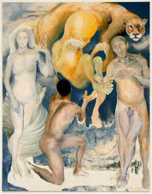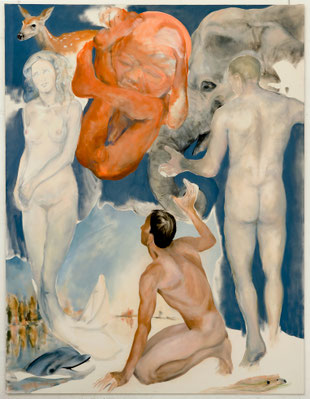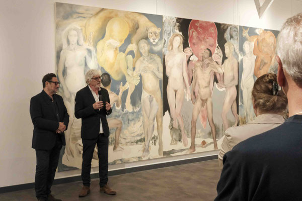 The second sequence would be a gradual gaze towards the painting since the notion of long time when addressing this discipline, is frequently brought forward by artists, critics or historians. After the feeling of a whole, which one gets familiar with little by little, the viewer gradually enters into a dialogue with the observed piece, especially with the subjects on the painted surface and as an artist recently told me while looking at the large triptych : “it is crowded!” [1](1).