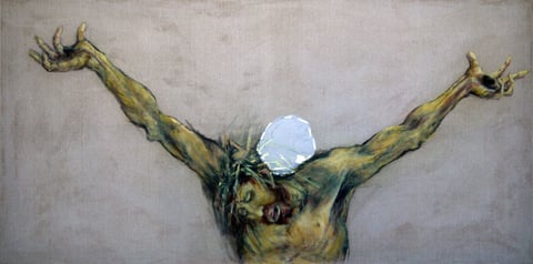 However, this tribute to Rogier Van Der Weyen untitled “Mollusks and Vertebrates”, evokes the model's life, a thirty three years old man suffering AIDS. It is not the Flanders of former/ancient Netherlands that my painting reveals most but more my teenager emotion in front of the scenes of The Scio Massacres of Eugène Delacroix, the delicateness of a foot painted by Botticelli, or remembrance of a glazed paper children book, often browsed to discover seafloor wonders.