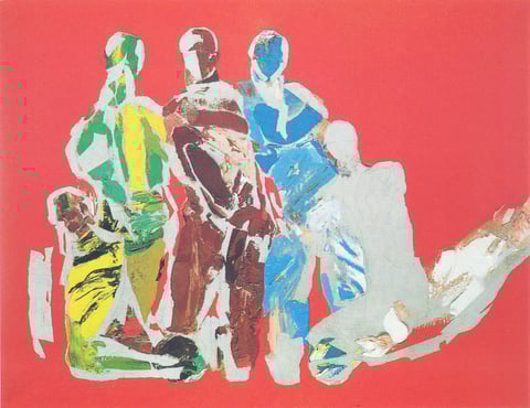 the figuration of torn bodies on a red background, desperately uniform (canvas 14).