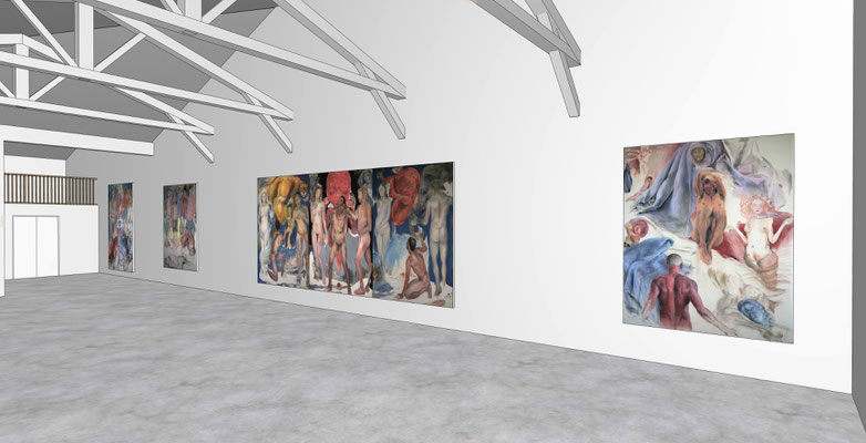Le premier serait celui d’une immersion dans la peinture par l’installation de grands formats plutôt verticaux et de hauteur variable mais unifiés par une largeur unique de 200 cm. Il restait à concevoir une scénographie claire, permettant une réception globale à partir de l’espace existant – une salle vaste d’un seul tenant – en s’appuyant sur la structure du lieu, à savoir le rythme de la charpente. Cette continuité entre architecture et peinture, tradition très ancienne, permet cet in situ que l’on retrouve fréquemment aujourd’hui dans l’art contemporain.